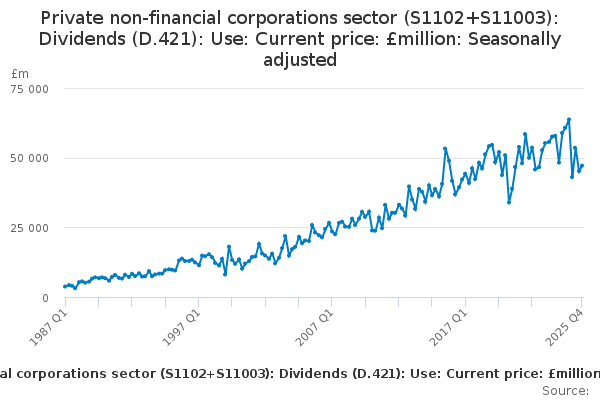 Download this time seriesPrivate non-financial corporations sector (S1102+S11003): Dividends (D.421): Use: Current price: £million: Seasonally adjusted