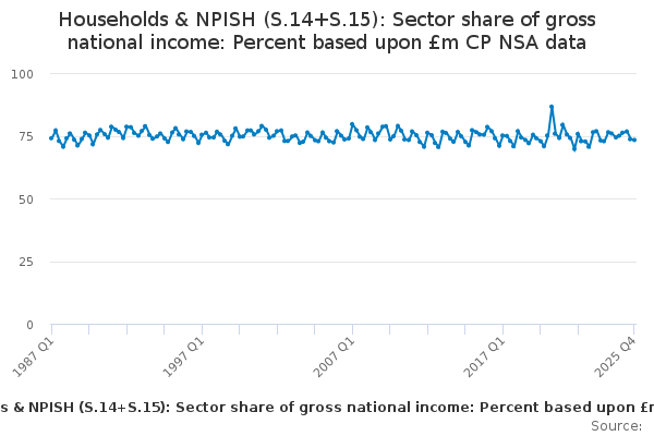 Download this time seriesHouseholds & NPISH (S.14+S.15): Sector share of gross national income: Percent based upon £m CP NSA data