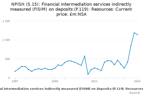 Download this time seriesNPISH (S.15): Financial intermediation services indirectly measured (FISIM) on deposits:(P.119): Resources: Current price: £m:NSA