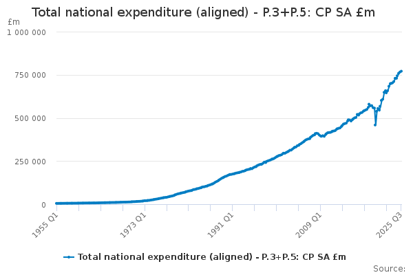 Download this time seriesTotal national expenditure (aligned) - P.3+P.5: CP SA £m