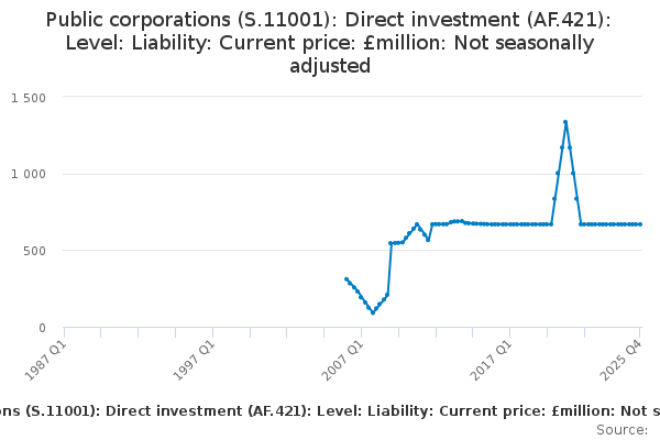 Download this time seriesPublic corporations (S.11001): Direct investment (AF.421): Level: Liability: Current price: £million: Not seasonally adjusted