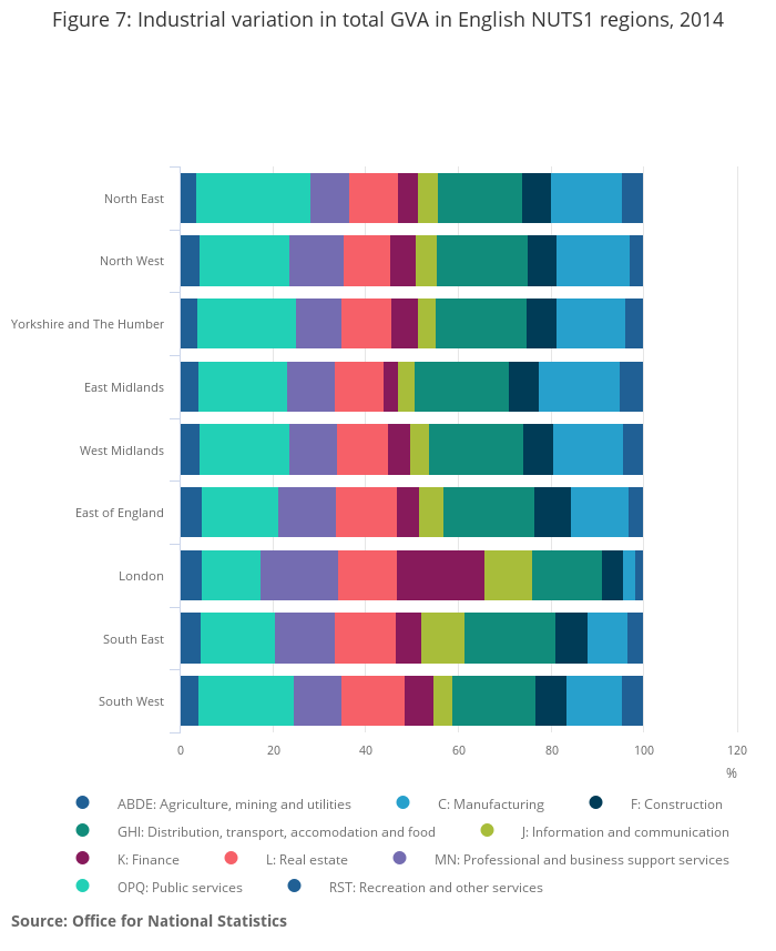 Figure 7: Industrial variation in total GVA in English NUTS1 regions, 2014
