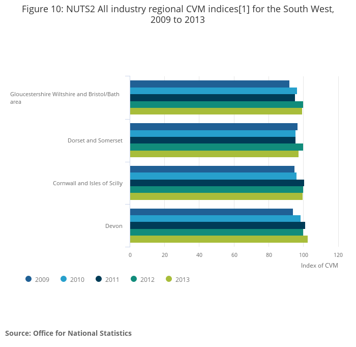 Figure 10: NUTS2 All industry regional CVM indices[1] for the South West, 2009 to 2013