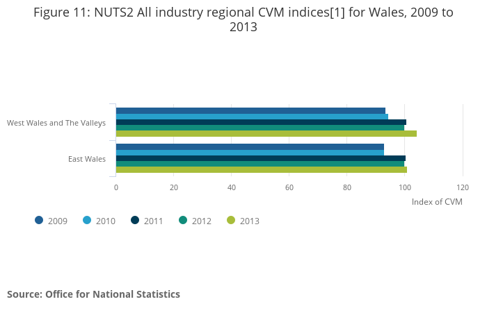 Figure 11: NUTS2 All industry regional CVM indices[1] for Wales, 2009 to 2013