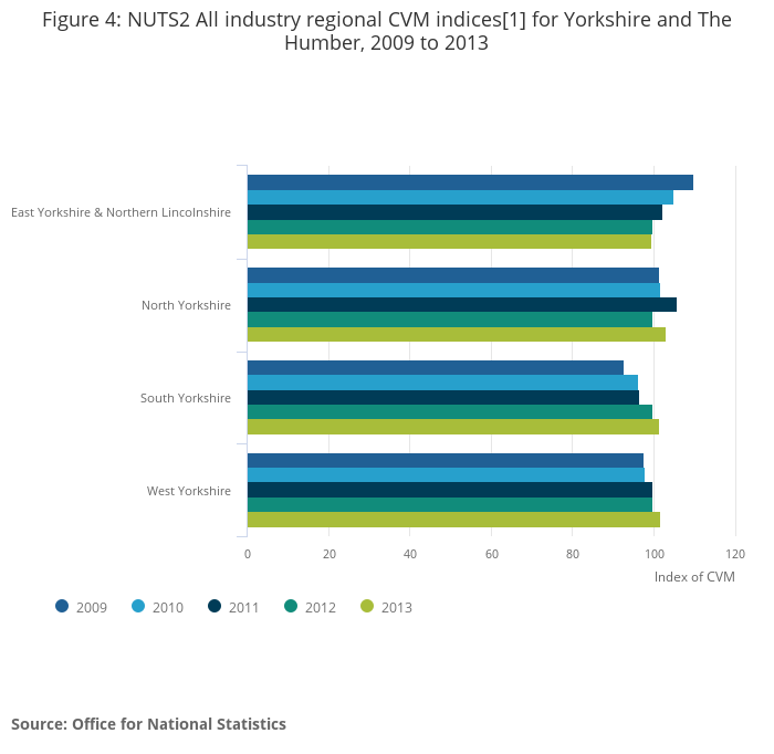Figure 4: NUTS2 All industry regional CVM indices[1] for Yorkshire and The Humber, 2009 to 2013