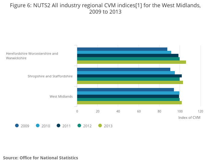 Figure 6: NUTS2 All industry regional CVM indices[1] for the West Midlands, 2009 to 2013