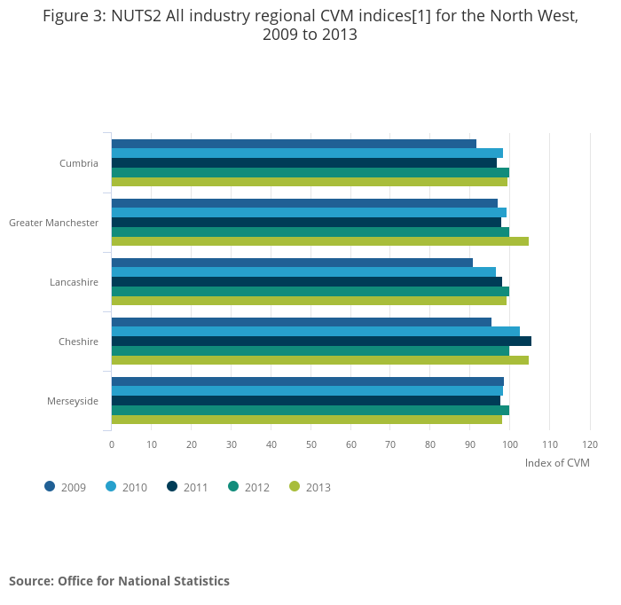 Figure 3: NUTS2 All industry regional CVM indices[1] for the North West, 2009 to 2013