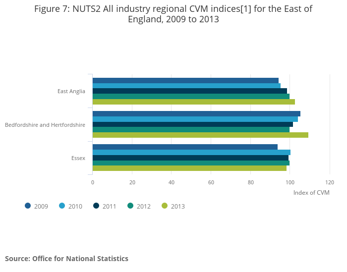 Figure 7: NUTS2 All industry regional CVM indices[1] for the East of England, 2009 to 2013