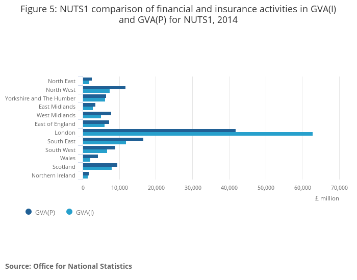 Download this chart Figure 5: NUTS1 comparison of financial and insurance activities in GVA(I) and GVA(P) for NUTS1, 2014