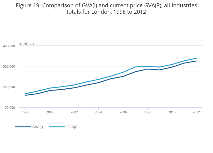 Download this chart Figure 19: Comparison of GVA(I) and current price GVA(P), all industries totals for London, 1998 to 2012
