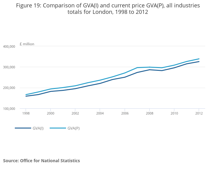 Figure 19: Comparison of GVA(I) and current price GVA(P), all industries totals for London, 1998 to 2012