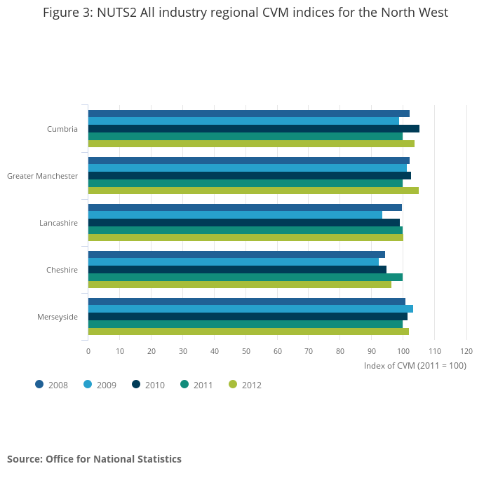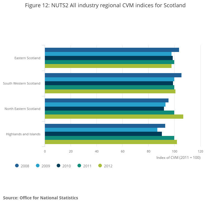 Of the NUTS2 sub-regions, North Eastern Scotland had the largest annual increase in real GVA in 2012, at 7.0%, followed by Berkshire, Buckinghamshire and Oxfordshire at 5.9%, and Greater Manchester at 5.0%