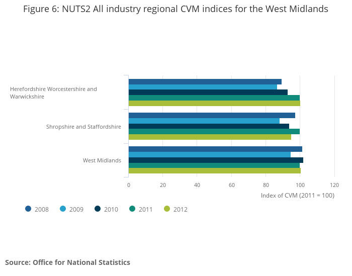Shropshire and Staffordshire was the NUTS2 sub-region with the largest annual decrease in real GVA in 2012, at -5.0%, followed by North Yorkshire, and Cornwall and Isles of Scilly, both at -4.9%