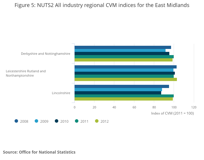 Constant price GVA(P) is derived by deflating the current price estimates for each of the 112 industries using national industry deflators obtained from the UK Gross Domestic Product (Output) system. These deflators are consistent with the National Accounts Blue Book 2014 and they are used because no regional price indices are currently available. The Eurostat Manual on regional accounts methods (2013 edition) recommends that in the absence of regional prices the use of national deflators is acceptable, provided that deflation occurs at a minimum level of 38 industries. Greater industrial detail allows the deflation to take account of regional variation in industrial, and hence product, composition