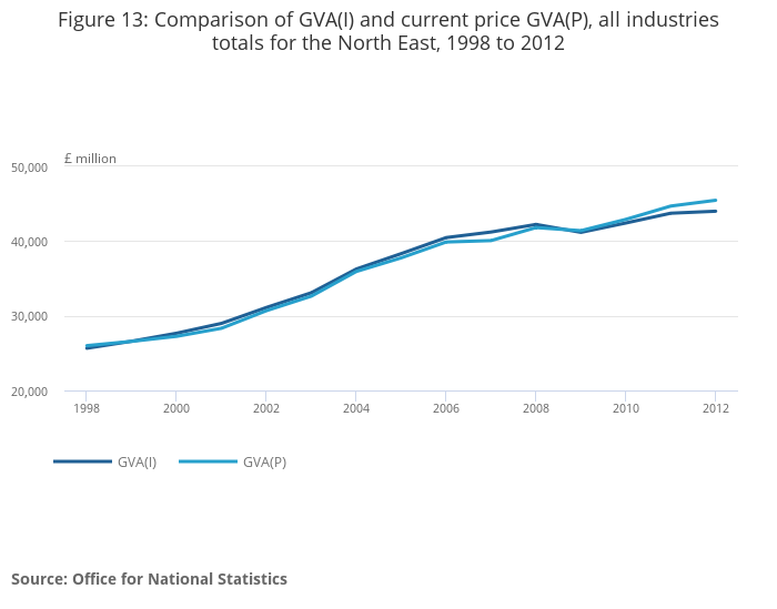 Image .csv .xlsIn the North East GVA(I) and GVA(P) were relatively similar throughout the period of comparison.