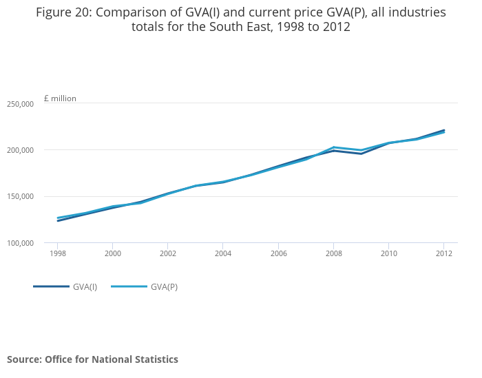 Figure 20: Comparison of GVA(I) and current price GVA(P), all industries totals for the South East, 1998 to 2012