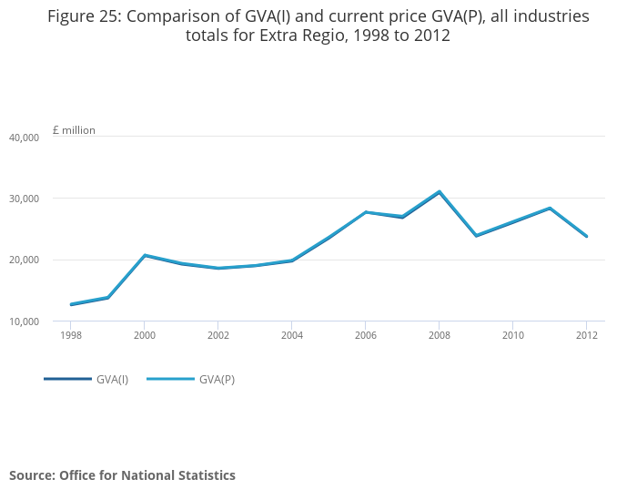 Figure 25: Comparison of GVA(I) and current price GVA(P), all industries totals for Extra Regio, 1998 to 2012