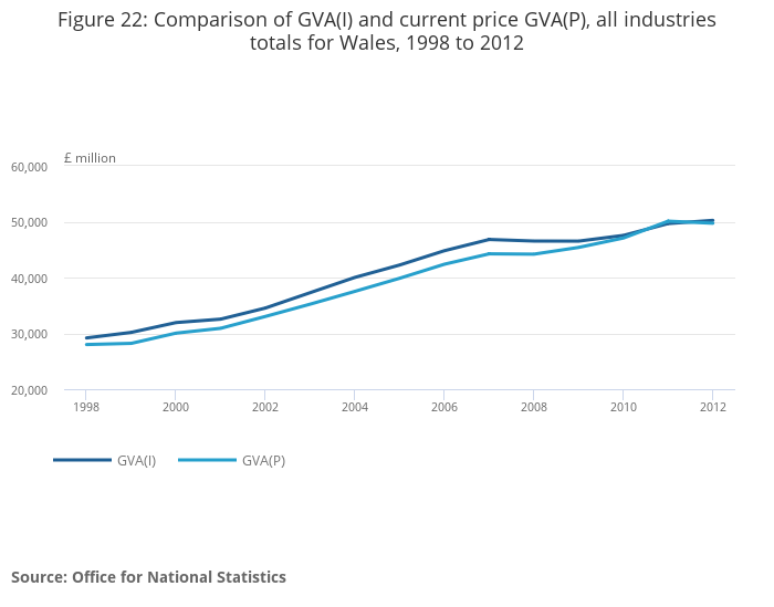 Figure 22: Comparison of GVA(I) and current price GVA(P), all industries totals for Wales, 1998 to 2012