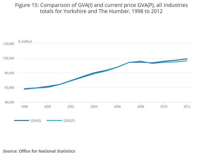 Figure 15: Comparison of GVA(I) and current price GVA(P), all industries totals for Yorkshire and The Humber, 1998 to 2012