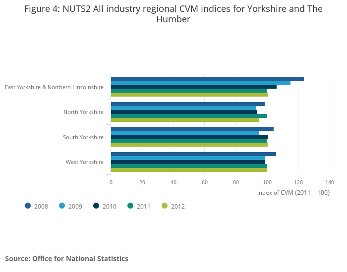 For the period 2008 to 2012, 2009 was the low point for nine regions. Scotland was lowest in both 2009 and 2010 (97.2). Yorkshire and The Humber was also lowest in both 2009 and 2010 (99.7), until decreasing to 99.5 in 2012.