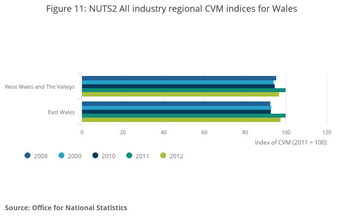 In 2012, of the NUTS1 regions, London had the largest annual increase in real GVA, at 2.4%, followed by the South East at 2.1%. Wales had the largest annual decrease at -2.8%