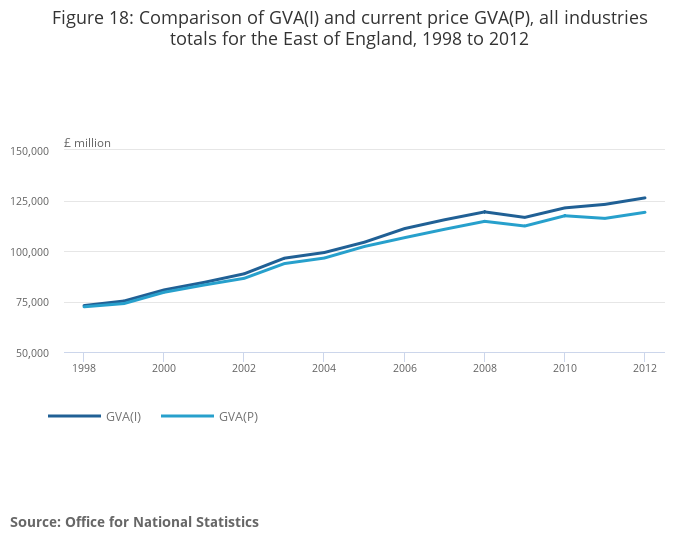 Figure 18: Comparison of GVA(I) and current price GVA(P), all industries totals for the East of England, 1998 to 2012
