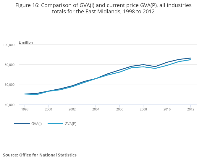 Figure 16: Comparison of GVA(I) and current price GVA(P), all industries totals for the East Midlands, 1998 to 2012