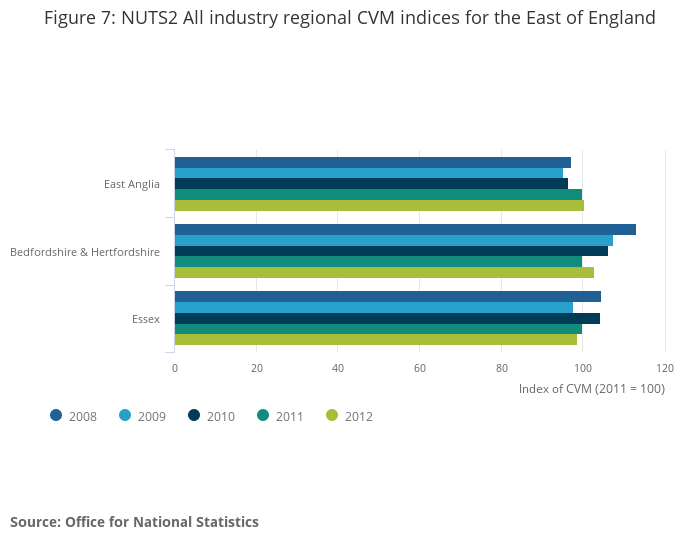In the same period, East Yorkshire and Northern Lincolnshire was the NUTS2 region that saw the largest decrease in real GVA, at -12.3%, followed by Bedfordshire and Hertfordshire at -4.4%, and Dorset and Somerset at -2.1%