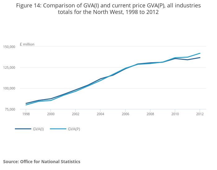 Figure 14: Comparison of GVA(I) and current price GVA(P), all industries totals for the North West, 1998 to 2012
