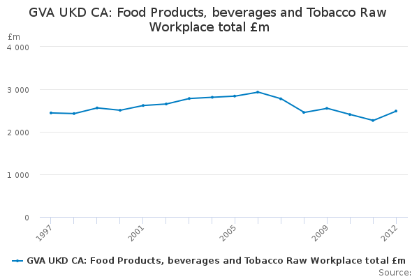 Download this time seriesGVA UKD CA: Food Products, beverages and Tobacco Raw Workplace total £m