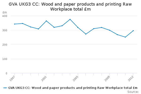 Download this time seriesGVA UKG3 CC: Wood and paper products and printing Raw Workplace total £m