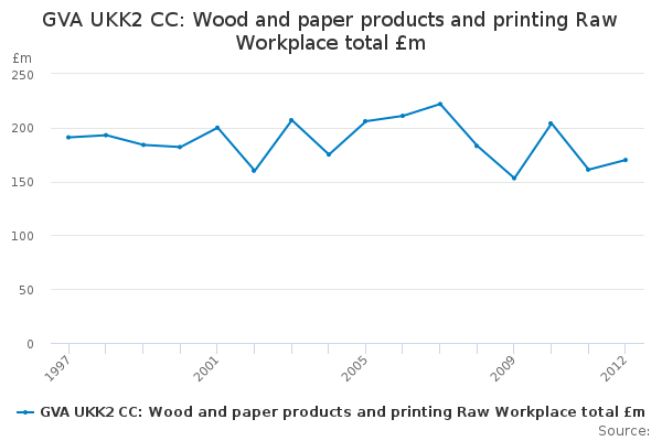 Download this time seriesGVA UKK2 CC: Wood and paper products and printing Raw Workplace total £m