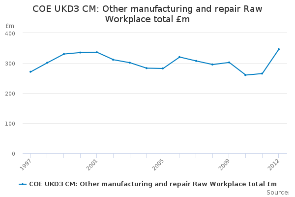 Download this time seriesCOE UKD3 CM: Other manufacturing and repair Raw Workplace total £m
