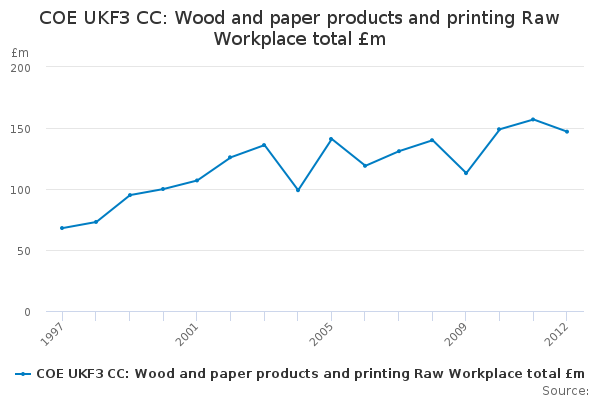 Download this time seriesCOE UKF3 CC: Wood and paper products and printing Raw Workplace total £m