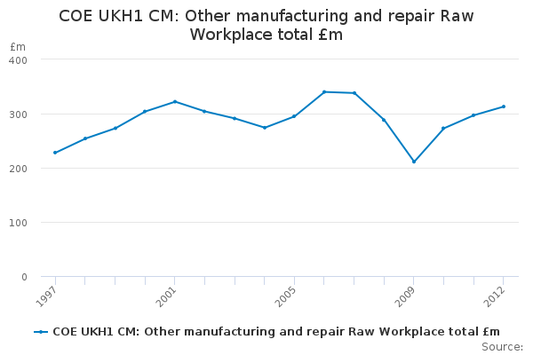 Download this time seriesCOE UKH1 CM: Other manufacturing and repair Raw Workplace total £m
