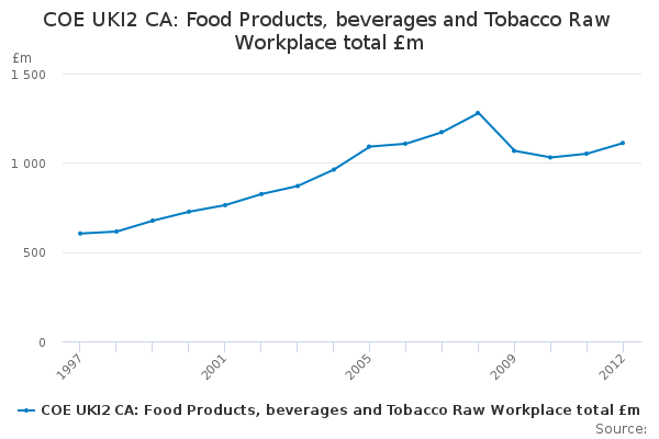 Download this time seriesCOE UKI2 CA: Food Products, beverages and Tobacco Raw Workplace total £m