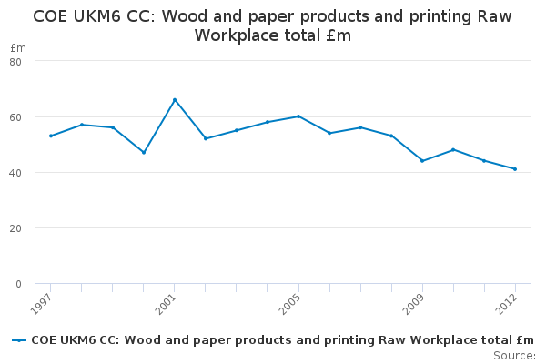 Download this time seriesCOE UKM6 CC: Wood and paper products and printing Raw Workplace total £m