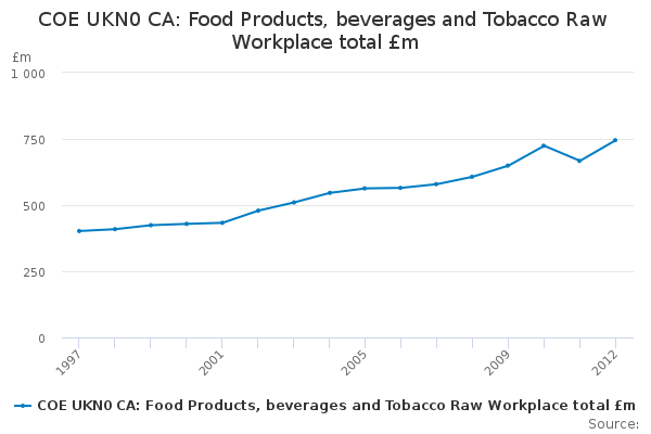 Download this time seriesCOE UKN0 CA: Food Products, beverages and Tobacco Raw Workplace total £m