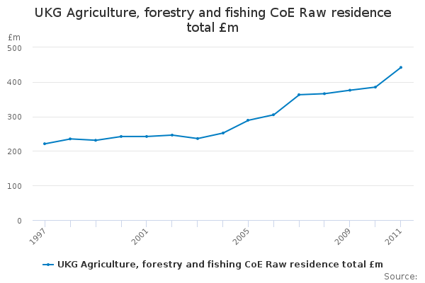 Download this time seriesUKG Agriculture, forestry and fishing CoE Raw residence total £m