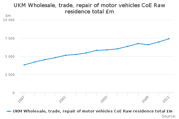 Download this time seriesUKM Wholesale, trade, repair of motor vehicles CoE Raw residence total £m