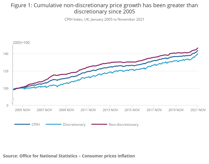 Since January 2005, prices for non-discretionary items have risen by around 49%, while prices for discretionary items have risen by around 41%.