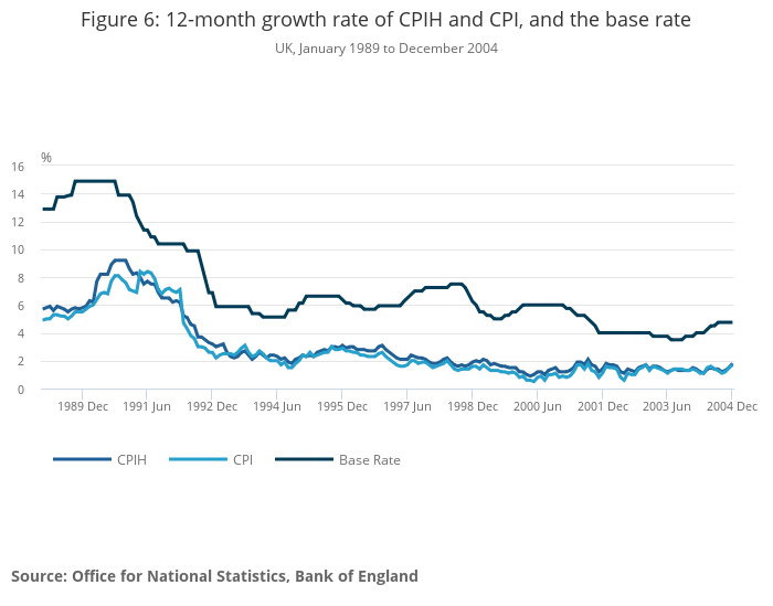 The base rate can also be compared with CPIH. The base rate is the interest rate on money held by commercial banks in the Bank of England.