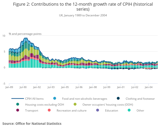The historical series shows the 12-month growth rate of CPIH peaked at 9.2% between September and December 1990 following sustained economic growth and rapid house price growth in the late 1980s.