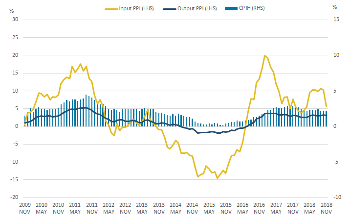 Download this image Figure 1: 12-month growth rates for input Producer Price Index (PPI) (left-hand side), output PPI (left-hand side), and Consumer Prices Index including owner occupiers' housing costs (CPIH) (right-hand side)