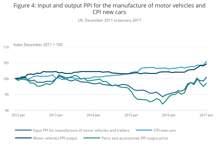 Image .csv .xlsFigure 4 shows that Producer Price index (PPI) input prices for cars closely follow the PPI output prices of parts and accessories for the motor vehicle supply chain, and both series have been rising steadily since the end of 2015. Factory gate prices for motor vehicles produced in the UK were flat between 2012 and the middle of 2016, but have recently started to increase in line with increased input costs and the costs of parts and accessories. This increase in costs may be eroding an element of profit margin for the retailer as consumer prices look to have remained relatively subdued throughout this time to maintain competitiveness.