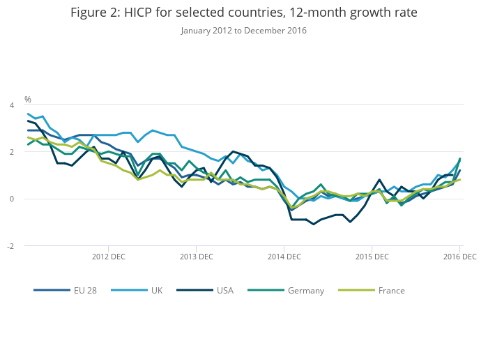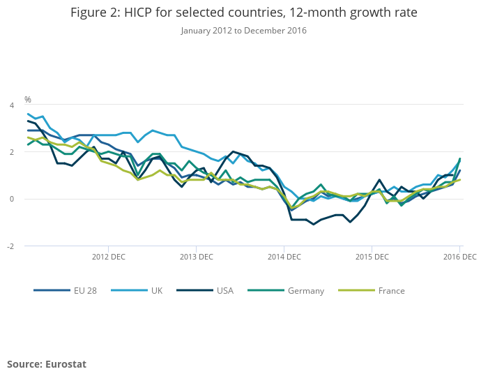 Figure 2 shows that HICP rates of inflation for the EU, Germany, the UK and USA are all over 1% for the first time in around 2 years. France’s inflation rate in comparison remains below 1% but has been increasing since March 2016.