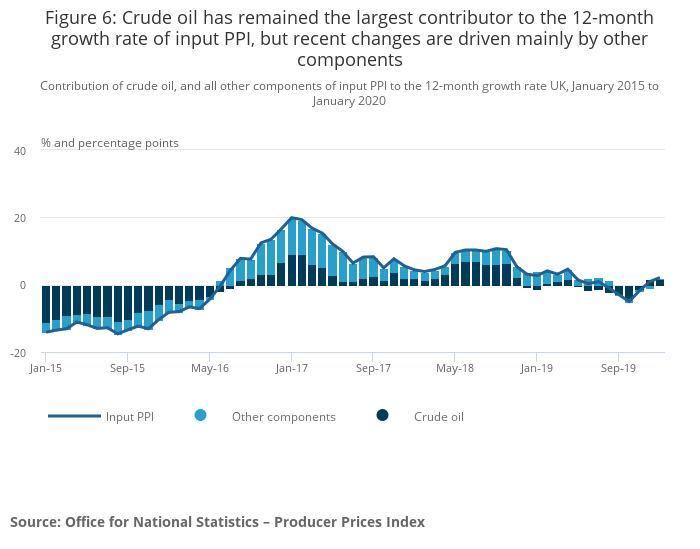 The input Producer Price Index (PPI) rose by 2.1% in the 12 months to January 2020, up from 0.9% in December 2019. This is the highest rate since April 2019, with crude oil providing the largest upward contribution to the annual rate of input inflation.