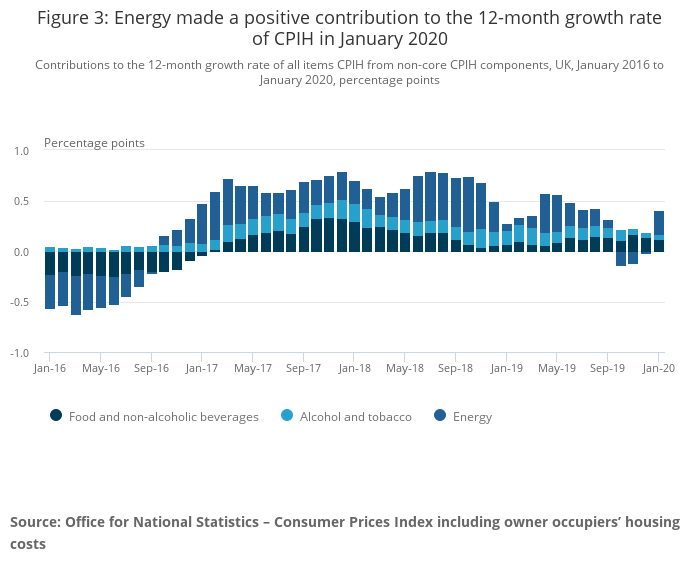 This sharp increase in contribution from energy is the result of a base effect, as prices remained unchanged between December 2019 and January 2020, but fell between December 2018 and January 2019. The Office of Gas and Electricity Markets (Ofgem) introduced an initial cap on consumer prices for energy in January 2019, with price falls for both gas and electricity. The cap was then increased in April 2019 and lowered again in October 2019.