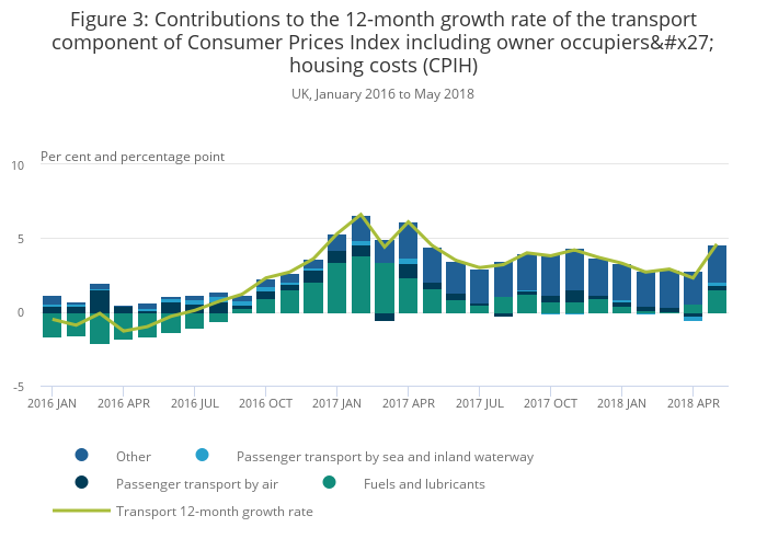 The increase in the 12-month growth rate of CPIH between April and May 2018 was driven largely by transport, with global prices for crude oil partially driving growth in the prices of fuels and lubricants.
