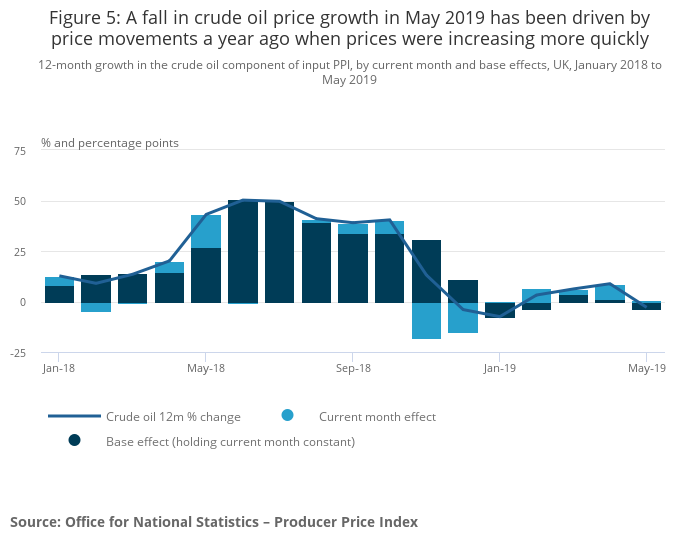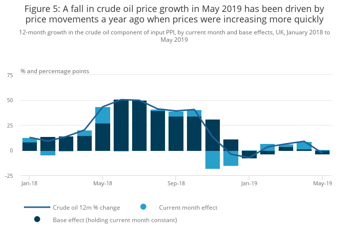 The 12-month growth rate of the crude oil component of the input Producer Price Index (PPI) fell to negative 2.9% in May 2019, down from positive annual growth of 8.8% in April 2019. This is despite the fact that prices for the crude oil component actually rose slightly between April and May 2019. Similar base effects were seen last month in the Consumer Prices Index including owner occupiers’ housing costs (CPIH).